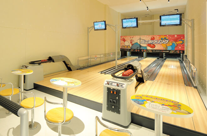 距離も短く、ボウル・ピンも小さいけど、本物のボウリングと変らない迫力が体験できます。